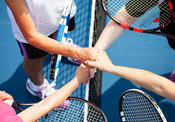 Four female tennis players holding rackets, shake hands, after game, above an outdoor net. Shot from above for a unique perspective.