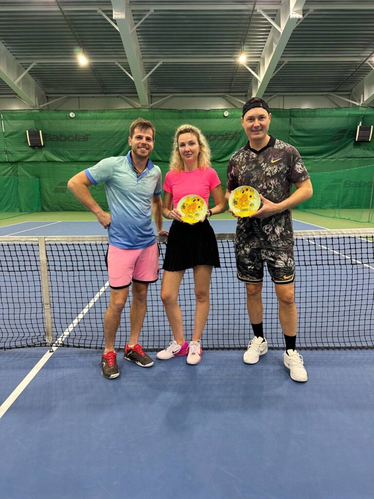 А вот в дополнительном турнире Tour сразу три участника стали победителями. Егоров Алексей и Екатерина Карпас лихо разобрались в первом матче против Дениса Решетникова и Саши Александровой, а вот партнерша Евгения Селезнева Надя Паздникова получает травму и ее заменяет Катя Карпас в матче против Дениса и Саши. Евгений с Катей также одерживают победу и главный судья принимает решение наградит трех участников этих баталий наградными тарелками. )